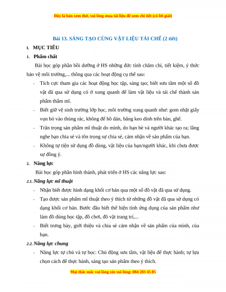 Bài 13. SÁNG TẠO CÙNG VẬT LIỆU TÁI CHẾ (2 tiết) I. MỤC TIÊU 1. Phẩm chất