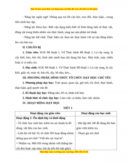 2. Học sinh: SGK Mĩ thuật 1, Vở Thực hành Mĩ thuật 1; Lá cây rụng, lá cây