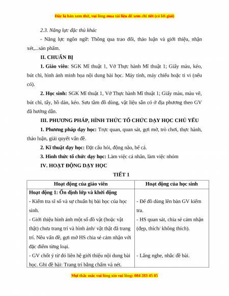 2. Học sinh: SGK Mĩ thuật 1, Vở Thực hành Mĩ thuật 1; Giấy màu, màu vẽ,