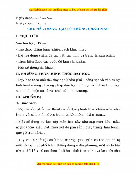 CHỦ ĐỀ 2: SÁNG TẠO TỪ NHỮNG CHẤM MÀU I. MỤC TIÊU Sau bài học, HS sẽ: