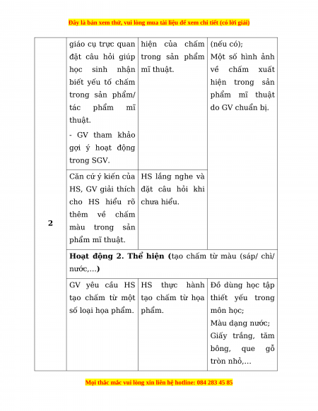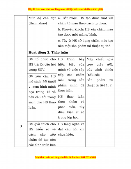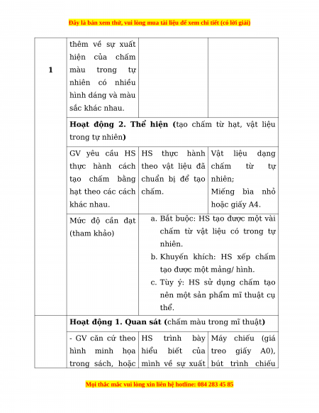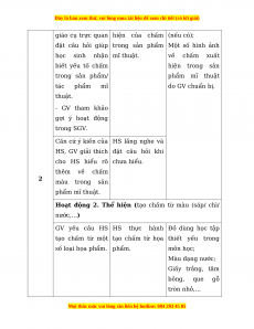 đặt câu hỏi giúp trong sản phẩm Một số hình ảnh học sinh nhận mĩ thuật. về chấm xuất biết yếu tố chấm hiện trong sản trong sản phẩm/ phẩm mĩ thuật tác phẩm mĩ do GV chuẩn bị. thuật. - GV tham khảo gợi ý hoạt động trong SGV.