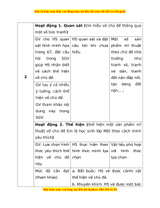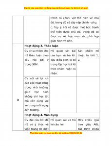 sát hình minh họa câu hỏi khi chưa phẩm mĩ thuật trang 67, đặt câu hiểu. theo chủ đề nhà hỏi trong SGV trường như giúp HS nhận biết tranh vẽ, tranh về cách thể hiện xé dán, tranh 2 về chủ đề. đất nặn đắp nổi, GV lưu ý có nhiều tạo dang đất ý tưởng, cách thể nặn,…; hiện về chủ đề. GV tham khảo nội dung này trong SGV.
