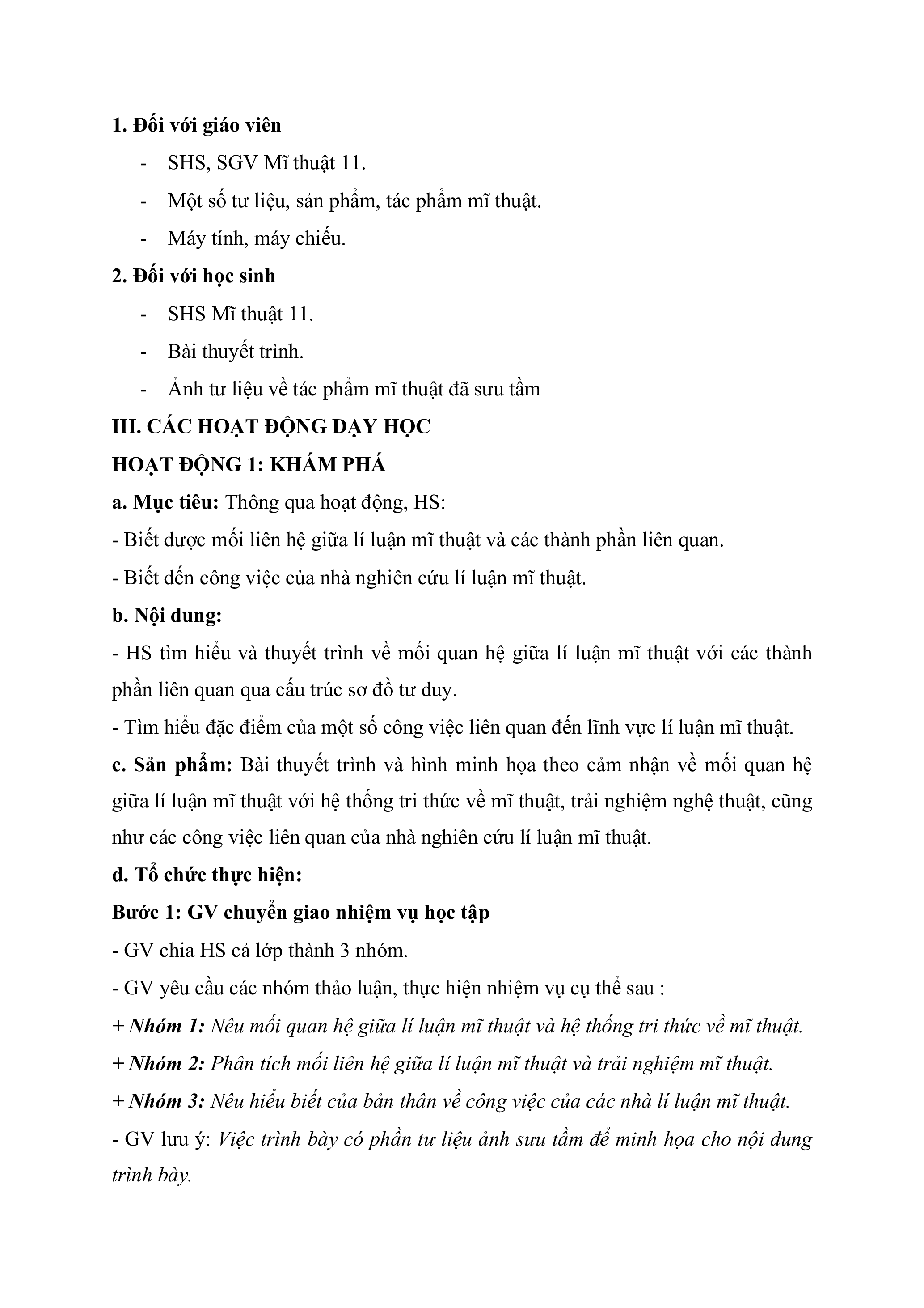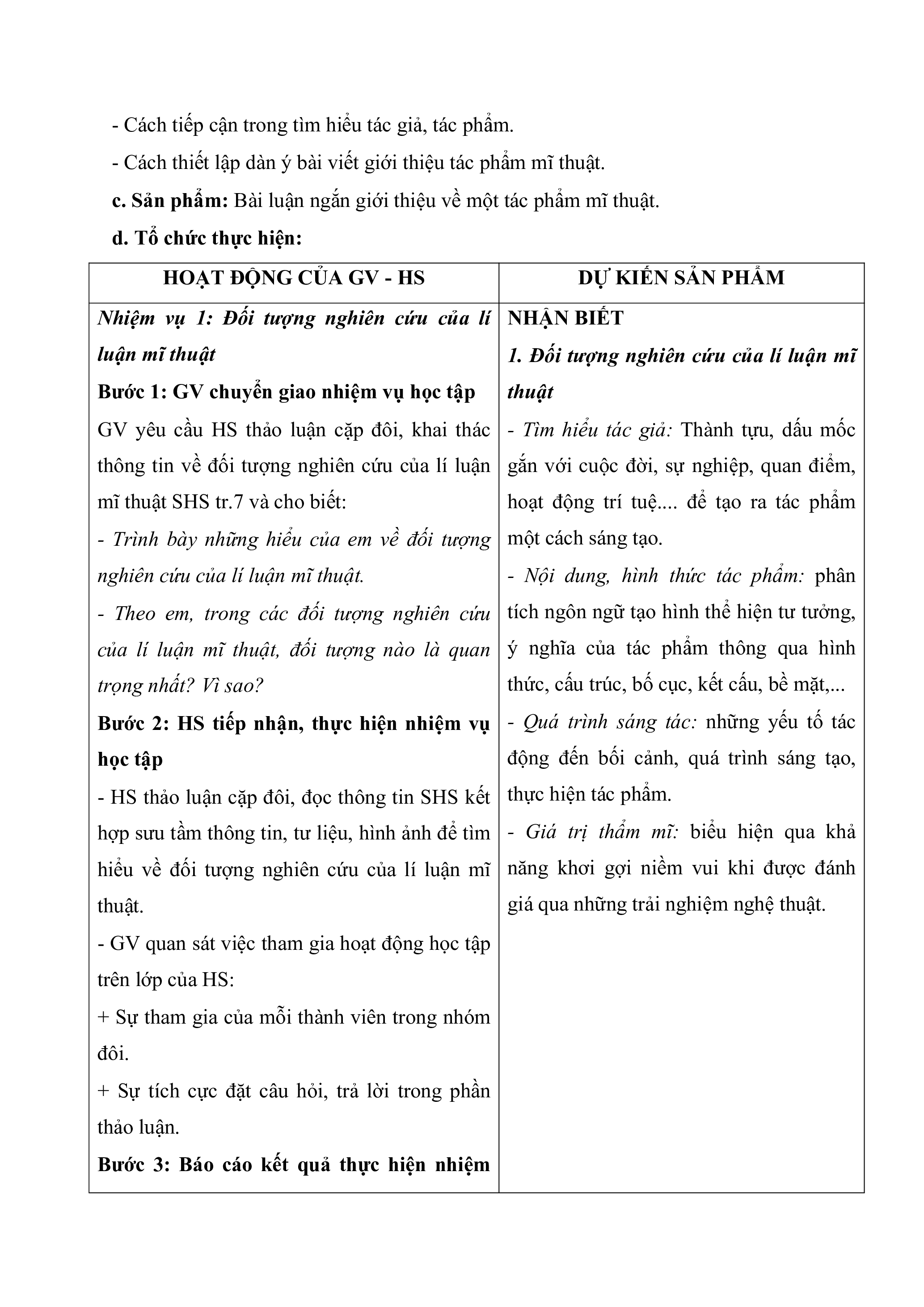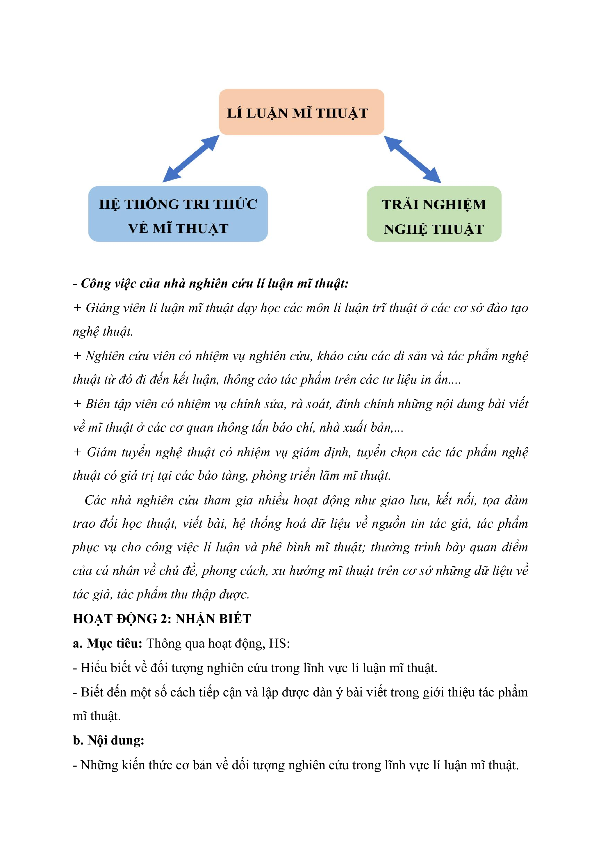 - Biết đến công việc của nhà nghiên cứu lí luận mĩ thuật. b. Nội dung: