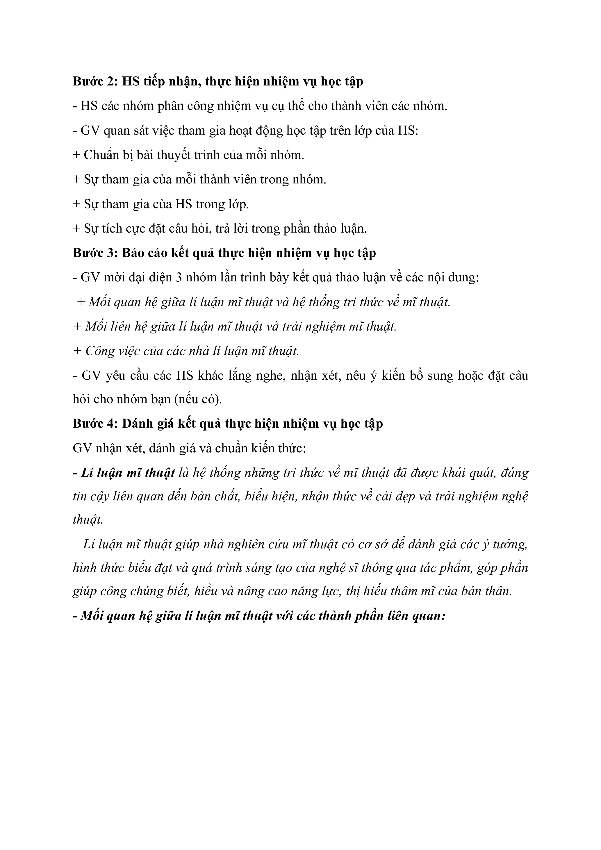 + Nhóm 2: Phân tích mối liên hệ giữa lí luận mĩ thuật và trải nghiệm mĩ thuật.