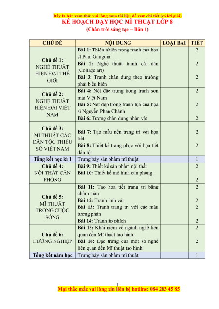 KẾ HOẠCH DẠY HỌC MĨ THUẬT LỚP 8