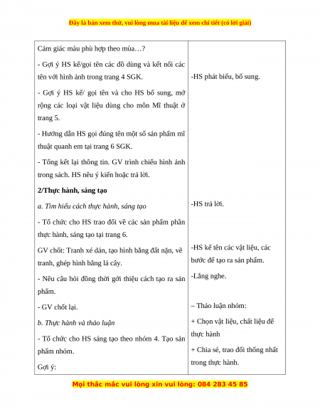 rộng các loại vật liệu dùng cho môn Mĩ thuật ở trang 5.