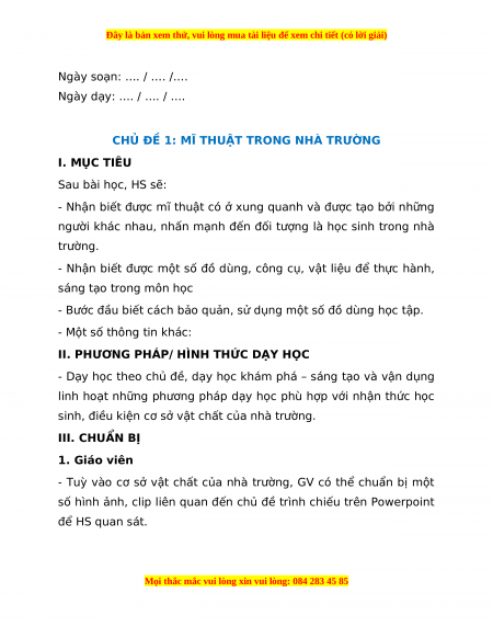 CHỦ ĐỀ 1: MĨ THUẬT TRONG NHÀ TRƯỜNG I. MỤC TIÊU Sau bài học, HS sẽ: