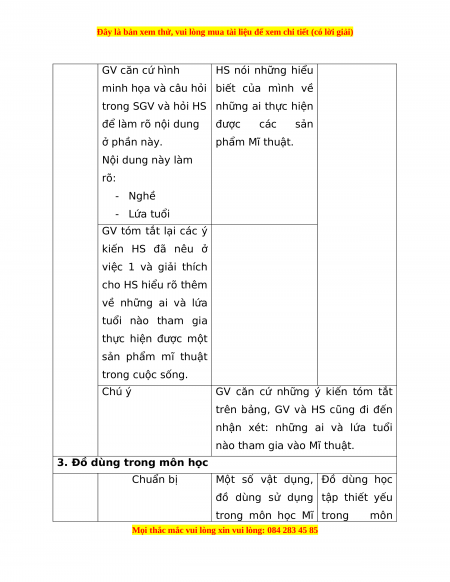 trong SGV và hỏi HS những ai thực hiện để làm rõ nội dung được các sản ở phần này. phẩm Mĩ thuật. Nội dung này làm rõ: - Nghề - Lứa tuổi GV tóm tắt lại các ý kiến HS đã nêu ở việc 1 và giải thích cho HS hiểu rõ thêm về những ai và lứa tuổi nào tham gia thực hiện được một sản phẩm mĩ thuật trong cuộc sống. Chú ý