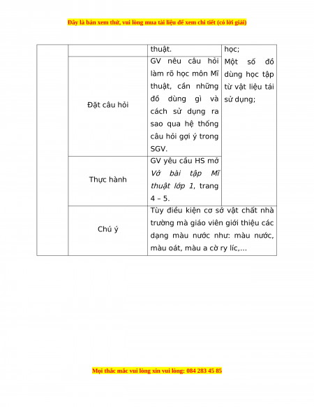 - Sách Mĩ thuật lớp 1, Vở thực hành Mĩ thuật lớp 1, đồ dùng học tập trong môn học.