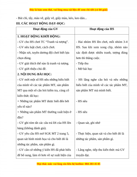 - Một số sản phẩm MT gần gũi tại địa phương. 2. Học sinh: - Sách học MT lớp 2. - Vở bài tập MT 2.
