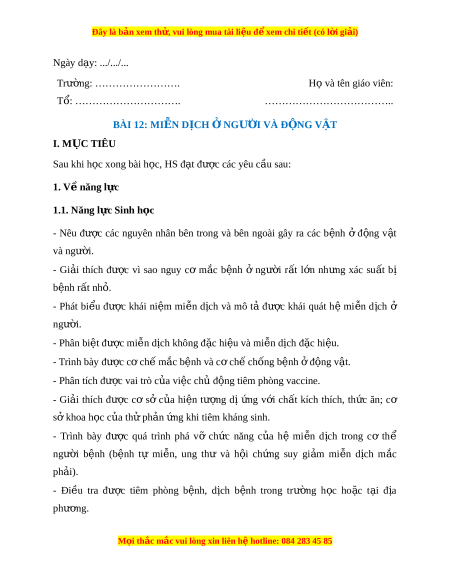 BÀI 12: MIỄN DỊCH N Ở GƯ I Ờ VÀ Đ N Ộ G VẬT I. M C Ụ TIÊU Sau khi h c ọ xong bài h c, H ọ S đ t ạ được các yêu c u s ầ au: 1. V năng l ề c ự 1.1. Năng l c Si ự nh h c ọ - Nêu đư c