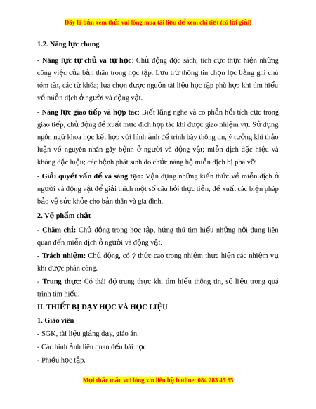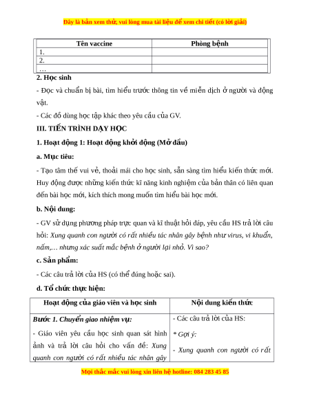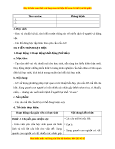 ấ đề và sáng t o: ạ V n ậ d ng ụ nh ng ữ ki n ế th c ứ về mi n ễ d ch ị ở ngư i ờ và đ ng ộ v t ậ để gi i ả thích m t ộ s ố câu h i ỏ th c ự ti n; ễ đ xu ề t ấ các bi n pháp ệ b o ả v s ệ c kh ứ e ỏ cho b n ả thân và gia đình. 2. V ph ề ẩm ch t ấ - Chăm ch : i Chủ đ ng ộ trong h c ọ t p, ậ h ng ứ thú tìm hi u ể nh ng ữ n i ộ dung liên quan đ n ế mi n ễ d ch ị ng ở ư i ờ và đ ng ộ v t ậ . - Trách nhi m ệ : Chủ đ ng, ộ có ý th c ứ cao trong nhi m ệ th c ự hi n ệ các nhi m ệ vụ khi đư c ợ phân công. - Trung th c: ự Có thái đ ộ trung th c ự khi tìm hi u ể thông tin, s ố li u ệ trong quá trình tìm hi u. ể II. THIÊT B D Ị AY H C O VÀ H C O LI U Ê 1. Giáo viên - SGK, tài li u g ệ i ng ả d y ạ , giáo án. - Các hình nh l ả iên quan đ n bài ế h c. ọ - Phi u h ế c t ọ p. ậ M i