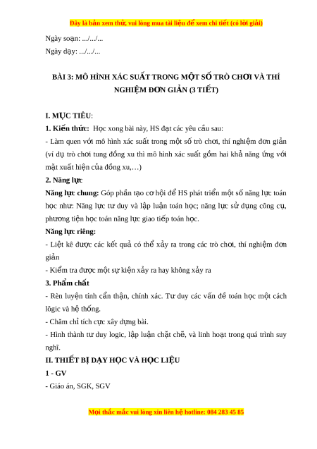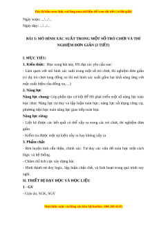 BÀI 3: MÔ HÌNH XÁC SU T Ấ TRONG M T Ộ S Ố TRÒ CH I Ơ VÀ THÍ NGHI M Ệ Đ N Ơ GI N Ả (3 TIẾT) I. M C Ụ TIÊU: 1. Ki n t ế h c ứ : H c ọ xong bài này, HS đ t ạ các yêu c u s ầ au: - Làm quen v i ớ mô hình xác su t ấ trong m t ộ số trò ch i ơ , thí nghi m ệ đ n ơ gi n ả (ví dụ trò ch i ơ tung đ ng