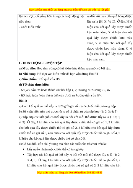 ộ có 1 quả bóng xanh và 1 qu ả bóng đ ; ỏ các quả bóng có kích thư c ớ và kh i ố lư ng ợ như nhau. L y ấ ng u ẫ nhiên m t ộ quả bóng trong h p. ộ - GV yêu cầu HS th o l ả u n ậ trả l i ờ : Nh ng k ữ t ế qu nào có t ả h x ể y r ả a? Bư c ớ 2: Th c ự hi n ệ nhi m ệ v : ụ HS l ng ắ nghe GV nêu tình hu ng, ố th o ả lu n ậ và trả l i ờ câu h i ỏ . Bư c ớ 3: Báo cáo, th o ả lu n: ậ GV g i ọ m t ộ số nhóm HS trả l i ờ , HS khác nh n ậ xét, bổ sung. Bư c ớ 4: K t ế lu n, ậ nh n ậ đ n