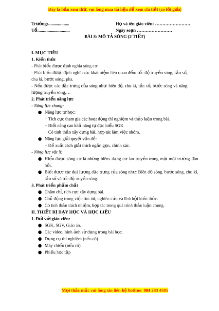 Ngày soạn …………………… BÀI 8: MÔ T S Ả ÓNG (2 TI T) Ế I. MỤC TIÊU 1. Ki n ế th c ứ - Phát bi u đ ể ược đ nh nghĩ ị a sóng cơ - Phát bi u ể đư c ợ đ nh ị nghĩa các khái ni m ệ liên quan đ n: ế t c ố đ ộ truy n ề sóng, t n ầ s , ố chu kì, bước sóng, pha. - N u ế đư c ợ các đ c ặ tr ng ư c a ủ sóng nh : ư biên đ , ộ chu kì, t n ầ s , ố bư c ớ sóng và năng lư ng ợ truy n s ề óng,… 2. Phát tri n ể năng l c ự - Năng l c ự chung: ● Năng l c ự t h ự c ọ : + Tích c c ự tham gia các ho t ạ đ ng t ộ hí nghi m ệ và th o l ả u n t ậ rong bài.