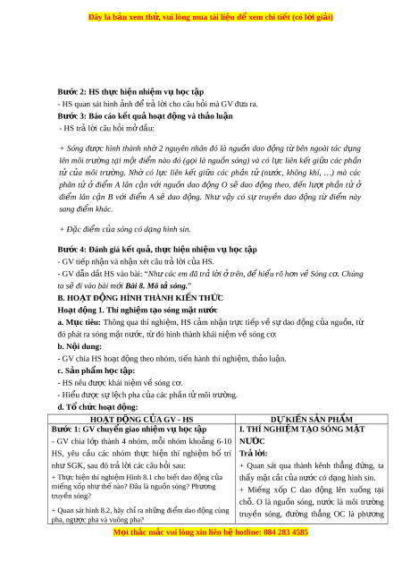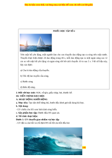 Đây là bản xem th , vu ử i lòng mua tài li u ệ đ xe ể m chi ti t ế (có l i ờ gi i ả ) PHIẾU HỌC T P Ậ S Ố 4 Trên mặt hồ yên l ng, ặ m t ộ ngư i ờ làm cho con thuy n ề dao đ ng ộ t o ạ ra sóng trên m t ặ nư c ớ . Thuyền th c ự hi n ệ đư c ợ 24 dao đ ng ộ trong 40 s, m i ỗ dao đ ng ộ t o ạ ra m t ộ ng n ọ sóng cao 12 cm so v i ớ m t ặ hồ yên l ng ặ và ng n ọ sóng t i ớ bờ cách thuy n ề 10 m sau 5 s. V i ớ s ố li u ệ này, hãy xác đ nh: ị a) Chu kì dao đ ng c ộ a ủ thuy n. ề b) T c ố đ l ộ an truyền c a ủ sóng. c) Bư c ớ sóng. d) Biên độ sóng. 2. Đ i ố v i ớ h c ọ sinh: SGK, v ghi ở , giấy nháp, bút, thư c ớ k . ẻ III. TI N Ế TRÌNH D Y Ạ H C Ọ A. HO T Ạ Đ N Ộ G KHỞI Đ N Ộ G a. M c