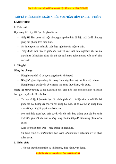 MÔ TẢ THÍ NGHIỆM NGẪU NHIÊN VỚI PHẦN MỀM EXCEL (1 TIẾT) I. MỤC TIÊU: