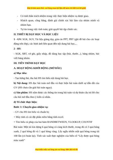 - HS nhận biết và ứng dụng được các tính chất của xác suất, dữ liệu trong phần mềm excel.
