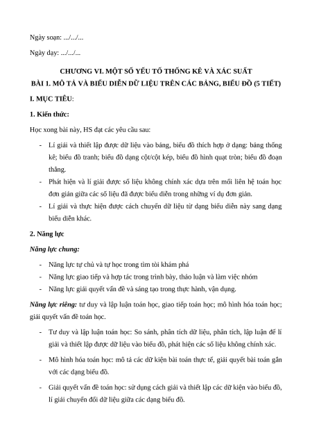 BÀI 1. MÔ TẢ VÀ BIỂU DIỄN DỮ LIỆU TRÊN CÁC BẢNG, BIỂU ĐỒ (5 TIẾT) I. MỤC TIÊU: