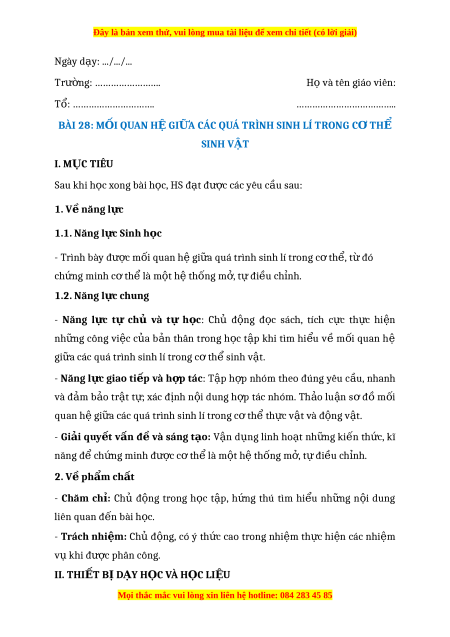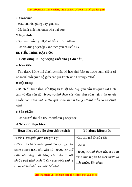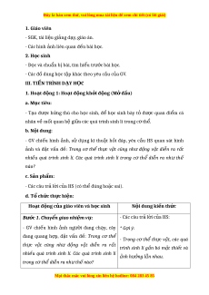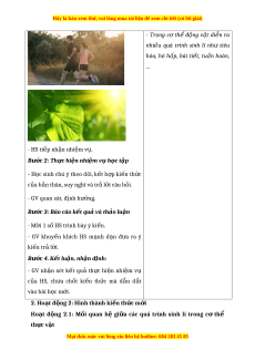 ề quá trình sinh lí. Các quá trình sinh lí trong cơ thể di n ễ ra như thế nào? c. S n ph ả m: ẩ - Các câu tr l ả i c ờ a HS (có th ủ đúng ho ể c sai). ặ d. T ch ổ c th ứ c hi ự n: ệ Ho t đ ạ ng c ộ a giáo viên và h ủ c sinh ọ Nội dung ki n th ế c ứ B c 1. Chuy ướ n giao nhi ể m v ệ : ụ - Các câu tr l ả i c ờ a HS: ủ - GV chi u ế hình nh ả ng i ườ đang ch y, ạ cây * G i ý: ợ đang quang h p, ợ đ t ặ v n ấ đ :