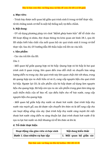 ố quan hệ các quá trình sinh lí trong c ơ thể th c v ự t. Sau đó, GV h ậ ư ng d ớ n HS th ẫ o lu ả n tr ậ l ả i các câu h ờ i. ỏ c. S n ph ả m: ẩ - Các câu tr l ả i c ờ a HS. ủ Câu 1: - M i ố quan hệ gi a ữ quang h p ợ và hô h p: ấ Quang h p ợ và hô h p ấ là hai quá