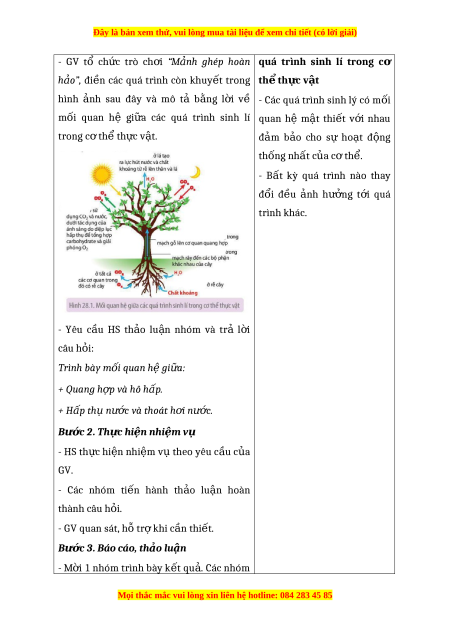 ợ Quá trình thoát h i ơ n c ướ ở lá t o r ạ a l c hút n ự c v ướ à ch t k ấ hoáng t r ừ lên t ễ hân và lên lá. d. T ch ổ c th ứ c hi ự n ệ Ho t đ ạ ng c ộ a giáo viên và h ủ c sinh ọ Nội dung ki n th ế c ứ B c 1. Giao nhi ướ m v ệ h ụ c t ọ p ậ 1. M i ố quan hệ gi a ữ các