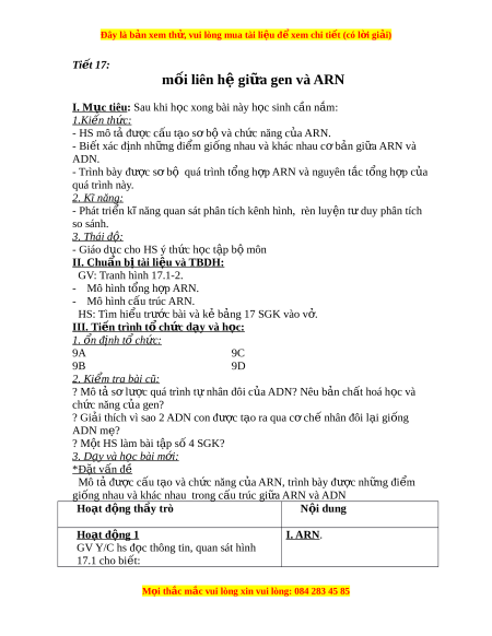 Đây là bản xem th , vu ử i lòng mua tài li u ệ đ xe ể m chi ti t (c ế ó l i ờ gi i ả ) Ti t ế 17: m i liên h ố gi ệ a gen và ữ ARN I. M c t