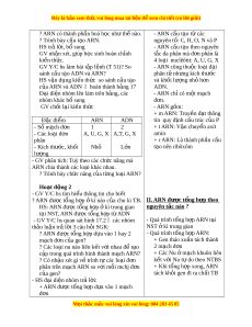 ủ ARN và ADN hoàn thành b ng 17 ả ADN. Đ i ạ di n nhó ệ m lên làm trên b ng, ả các - ARN chỉ có m t ộ m ch ạ nhóm khác bổ sung đ n. ơ GV chốt l i ạ ki n t ế h c ứ - ARN gồm: + m ARN: Truy n đ ề t ạ thông Đặc đi m ể ARN ADN tin quy định c u t ấ rúc c a P ủ - Số m ch ạ đ n ơ 1 2 + t ARN: V n chuy ậ n ể axít - Các lo i ạ đ n ơ A, U, G, X A,T, G, X amin phân + r ARN: Là thành ph n c ầ u ấ - Kích thư c, ớ kh i ố Nhỏ L n ớ t o nên r ạ ibôxôm lư ng ợ