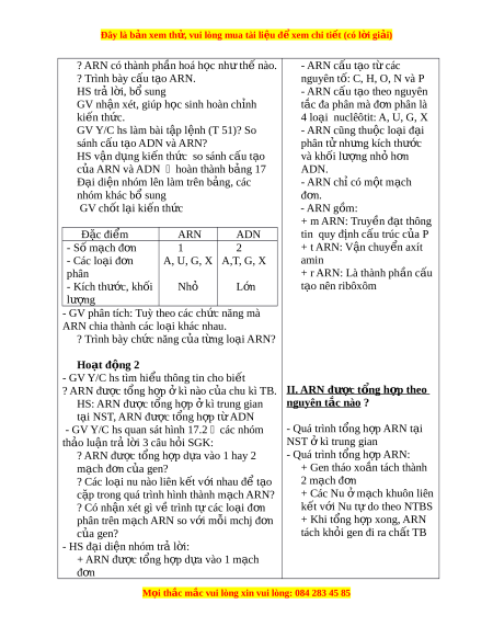 Đây là bản xem th , vu ử i lòng mua tài li u ệ đ xe ể m chi ti t (c ế ó l i ờ gi i ả ) ? ARN có thành ph n hoá h ầ c ọ nh t ư h nào. ế - ARN cấu t o ạ t các ừ ? Trình bày c u t ấ o ạ ARN. nguyên t : ố C, H, O, N và P HS tr l ả i ờ , bổ sung - ARN cấu t o ạ theo nguyên GV nh n xét ậ , giúp h c ọ sinh hoàn ch nh ỉ t c đa ắ phân mà đ n phân l ơ à ki n t ế h c. ứ 4 lo i ạ nuclêôtit: A, U, G, X GV Y/C hs làm bài t p l ậ nh ( ệ T 51)? So - ARN cũng thu c ộ lo i ạ đ i ạ sánh cấu t o ạ ADN và ARN? phân t nh ử ng kí ư ch thư c ớ HS v n ậ d ng ki ụ n t ế h c s ứ o sánh c u t ấ o ạ và khối lư ng nh ợ h ỏ n ơ c a