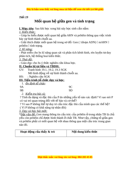 Giáo án Mối quan hệ giữa gen và tính trạng Sinh học 9