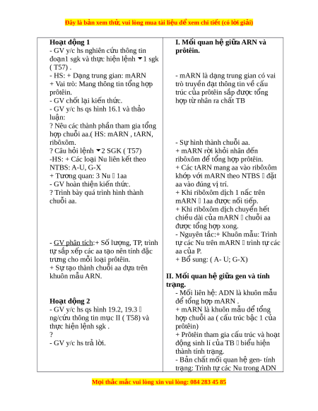 Đây là bản xem th , vu ử i lòng mua tài li u ệ đ xe ể m chi ti t (c ế ó l i ờ gi i ả ) Hoạt đ ng 1 ộ I. M i ố quan h gi ệ a ữ ARN và - GV y/c hs nghiên c u ứ thông tin prôtêin. đo n1 ạ sgk và th c ự hi n l ệ nh ệ 1 sgk ( T57) . - HS: + D ng t ạ rung gian: mARN - mARN là d ng t ạ rung gian có vai