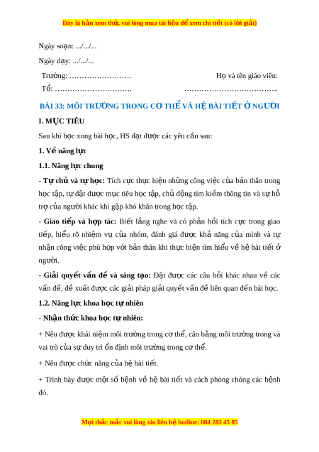 ……………………………….. BÀI 33: MÔI TRƯ N Ờ G TRONG C Ơ TH Ể VÀ H B Ệ ÀI TI T Ế N Ở GƯ I Ờ I. M C Ụ TIÊU Sau khi h c ọ xong bài h c, H ọ S đ t ạ được các yêu c u s ầ au: 1. V năng l ề c ự 1.1. Năng l c chung ự