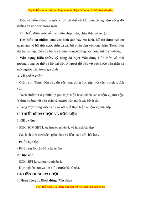 ờ trong cơ thể và hệ bài ti t ế ở ngư i ờ để b o ả vệ s c ứ kh e ỏ b n ả thân và m i ọ ngư i ờ thân trong gia đình. 3. V p ề hẩm ch t ấ - Chăm ch : ỉ Th c ự hi n ệ đ y ầ đủ các ho t ạ đ ng ộ h c ọ t p ậ m t ộ cách tự giác, tích c c. ự - Trách nhi m ệ : Có ý th c ứ t ự giác th c ự hi n ệ hoàn thành các nhi m ệ v ụ h c ọ t p. ậ Ý th c ứ t b ự o v ả b ệ n ả thân và ngư i ờ thân tránh các b nh t ệ t ậ . - Trung th c ự trong vi c báo cáo ệ k t ế qu t ả h c ự hi n nhi ệ m ệ v h ụ c ọ t p. ậ II. THIẾT B D Ị ẠY H C Ọ VÀ H C Ọ LI U Ệ 1. Giáo viên: - SGK, SGV, SBT khoa h c ọ t nhi ự ên 8, k ho ế ch ạ bài d y ạ . - Các hình nh
