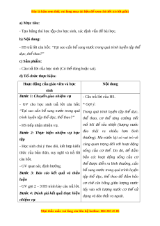 ớ trong quá trình luy n ệ t p ậ thể d c, ụ th t ể hao?” c) S n ph ả m ẩ : - Câu tr l ả i ờ c a ủ h c s ọ inh (Có th đúng ho ể c ặ sai). d) T ch ổ ức thực hi n: ệ Hoạt đ ng c ộ a ủ giáo viên và h c ọ N i ộ dung sinh Bư c ớ 1: Chuy n gi ể ao nhi m ệ vụ - Câu tr l ả i ờ c a H ủ S. - GV cho h c ọ sinh trả l i ờ câu h i ỏ : * G i ợ ý: “T i ạ sao c n ầ bổ sung nư c