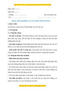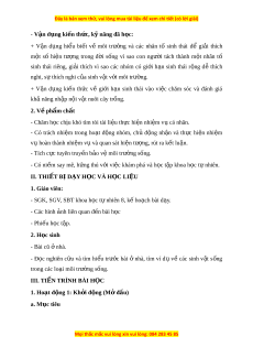 ả thích vì sao các nhóm có gi i ớ h n ạ sinh thái r ng ộ dễ thích nghi, sự thích nghi c a s ủ inh v t ậ v i ớ môi trư ng. ờ + V n ậ d ng ụ ki n ế th c ứ về gi i ớ h n ạ sinh thái vào vi c ệ chăm sóc và đánh giá khả năng nh p n ậ i ộ v t ậ nuôi cây trồng. 2. V ph ề ẩm ch t ấ - Chăm h c ọ ch u khó t ị ìm tòi tài li u t ệ h c hi ự n nhi ệ m ệ v cá nhân. ụ - Có trách nhi m ệ trong ho t ạ đ ng ộ nhóm, chủ đ ng ộ nh n ậ và th c ự hi n ệ nhi m ệ v hoàn ụ thành nhi m ệ vụ và quan sát hi n t ệ ư ng, ợ rút ra k t ế lu n. ậ - Tích c c t ự uyên truy n b ề o ả v m ệ ôi trư ng s ờ ng. ố - Có ni m ề say mê, h ng t ứ hú v i ớ vi c khám ệ phá và h c t ọ p khoa ậ h c t ọ nhi ự ên.