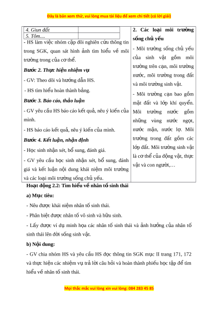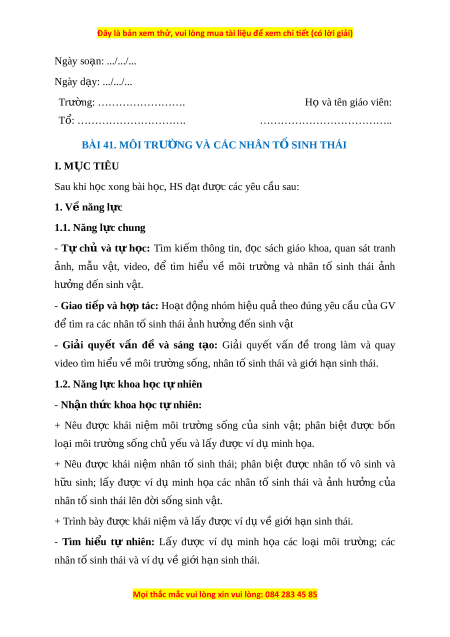 ấ đề và sáng t o: ạ Gi i ả quy t ế v n ấ đề trong làm và quay video tìm hi u v ể m ề ôi trư ng s ờ ng, nhân t ố s ố inh thái và gi i ớ h n s ạ inh thái. 1.2. Năng l c khoa h ự c t ọ nhi ự ên - Nhận th c ứ khoa h c ọ t nhi ự ên: + Nêu đư c ợ khái ni m ệ môi trư ng ờ s ng ố c a ủ sinh v t ậ ; phân bi t ệ đư c ợ b n ố lo i ạ môi trư ng s ờ ng ố ch y ủ u và l ế y đ ấ ư c ví ợ dụ minh h a. ọ + Nêu đư c ợ khái ni m