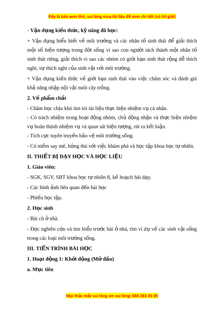 II. THIẾT BỊ DẠY H C Ọ VÀ H C Ọ LI U Ệ 1. Giáo viên: - SGK, SGV, SBT khoa h c t ọ nhi ự ên 8, k ho ế ch ạ bài d y ạ . - Các hình nh l ả iên quan đ n bài ế h c ọ - Phi u h ế c t ọ p. ậ 2. H c ọ sinh - Bài cũ nhà. ở - Đ c ọ nghiên c u ứ và tìm hi u ể trư c ớ bài ở nhà, tìm ví d ụ v ề các sinh v t ậ s ng ố trong các lo i ạ môi trư ng s ờ ng. ố