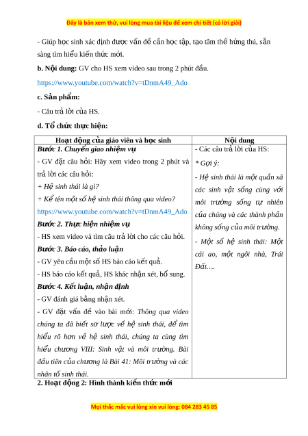 https://www.youtube.com/watch?v=tDnmA49_Ado c. Sản phẩm: - Câu tr l ả i ờ c a H ủ S. d. T ch ổ ức thực hi n ệ : Hoạt đ ng c ộ a g ủ iáo viên và h c ọ sinh N i ộ dung Bư c ớ 1. Chuy n gi ể ao nhi m ệ vụ - Các câu tr l ả i ờ c a H ủ S: - GV đ t ặ câu h i