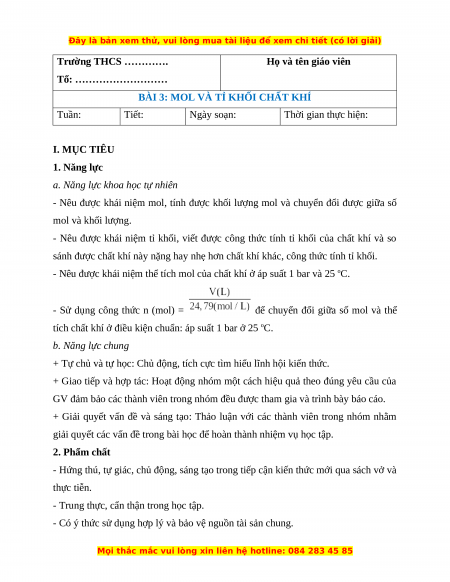 BÀI 3: MOL VÀ TỈ KHỐI CHẤT KHÍ Tuần: Tiết: Ngày soạn: Thời gian thực hiện: I. MỤC TIÊU 1. Năng lực