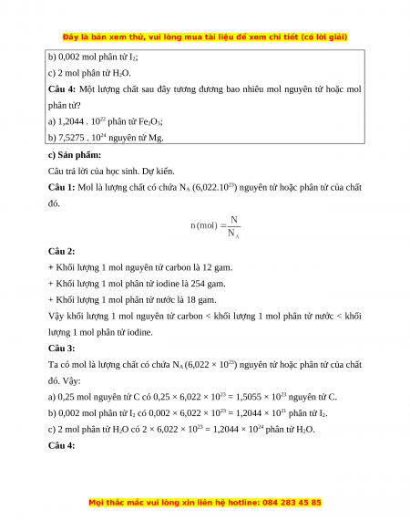 c) 2 mol phân tử H2O có 2 × 6,022 × 1023 = 1,2044 × 1024 phân tử H2O. Câu 4: