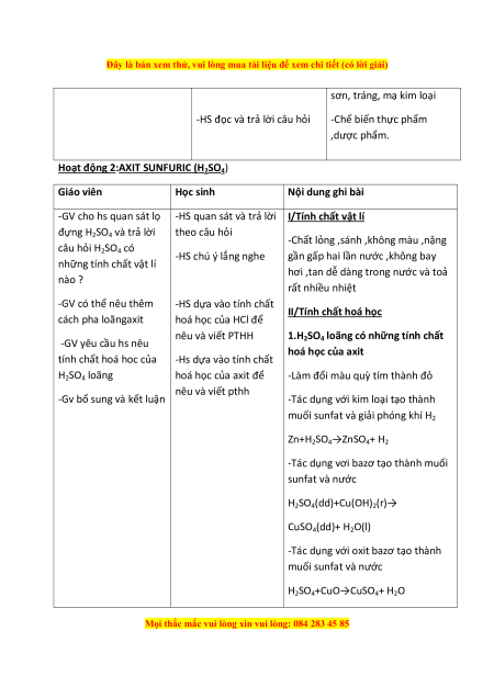 Hoạt động 2:AXIT SUNFURIC (H2SO4) Giáo viên Học sinh Nội dung ghi bài