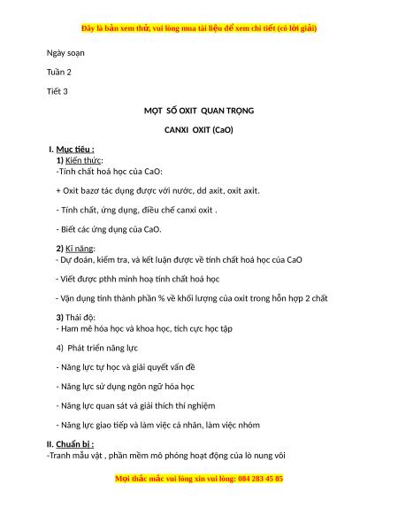 MỘT SỐ OXIT QUAN TRỌNG CANXI OXIT (CaO) I. M ục tiêu : 1) K iến thức :