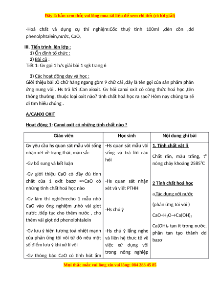 -Hoá chất và dụng cụ thí nghiệm:Cốc thuỷ tinh 100ml ,đèn cồn ,dd phenolphtalein,nước, CaO, III. T