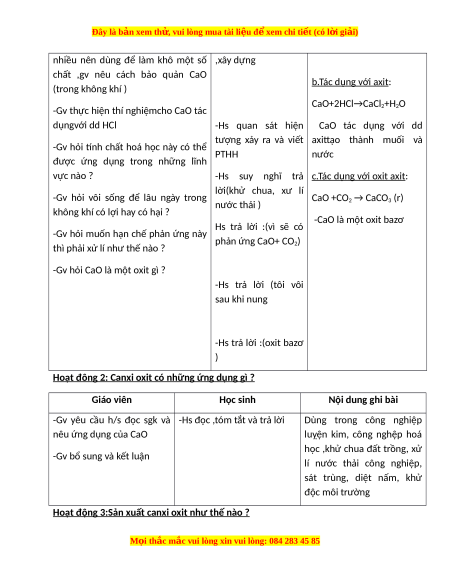 Hoạt động 1: Canxi oxit có những tính chất nào ? Giáo viên Học sinh Nội dung ghi bài