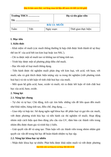 Tổ: ……………………… BÀI 13: MUỐI Tuần: Tiết: Ngày soạn: Thời gian thực hiện: I. Mục tiêu 1. Kiến thức