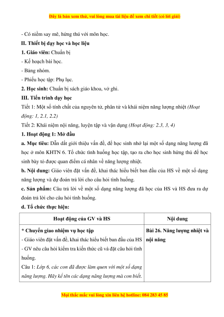 - Giáo viên đặt vấn đề, khai thác hiểu biết ban đầu của HS nội năng