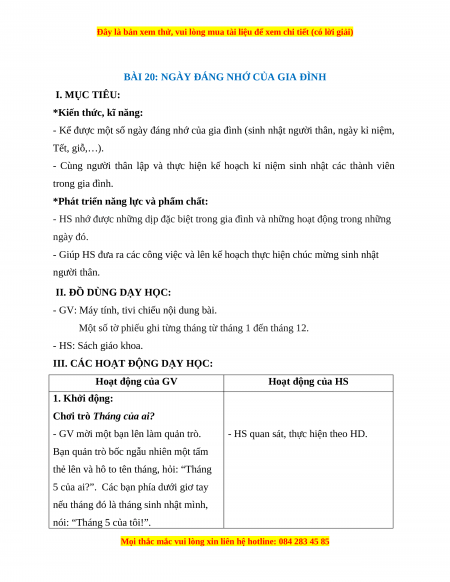 BÀI 20: NGÀY ĐÁNG NHỚ CỦA GIA ĐÌNH I. MỤC TIÊU: