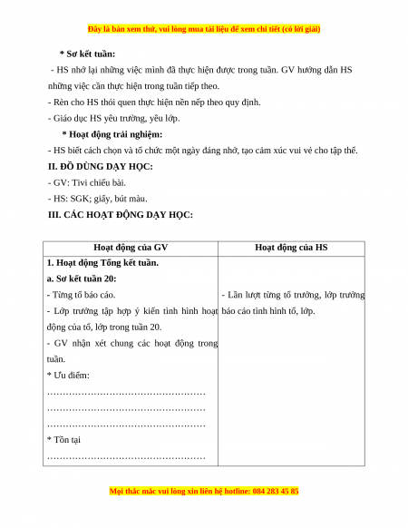 1. Hoạt động Tổng kết tuần. a. Sơ kết tuần 20: