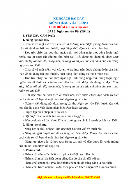 BÀI 3: Ngày em vào Đội (Tiết 1) I. YÊU CẦU CẦN ĐẠT: 1. Năng lực đặc thù.