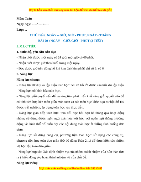 BÀI 29 : NGÀY – GI , G Ờ IỜ - PHÚT (2 TI T Ế ) I. M C Ụ TIÊU 1. Mức đ , ộ yêu c u c ầ n đ ầ t ạ - Nh n bi ậ t ế được m t ộ ngày có 24 gi ; ờ m t ộ gi có 60 phút ờ . - Nh n bi ậ t ế được gi t ờ heo buổi trong m t ộ ngày. - Đ c đ ọ ư c ợ gi t ờ rên đ ng h ồ khi ồ kim đài (kim phút) ch s ỉ 3, s ố 6. ố 2. Năng l c ự Năng l c chung ự : - Năng l c t ự duy và ư l p l ậ u n t ậ oán h c: ọ nêu và tr l ả i ờ đư c ợ câu h i ỏ khi l p ậ lu n ậ - Năng l c m ự ô hình hóa toán h c. ọ - Năng l c ự gi i ả quy t ế v n ấ đ và ề sáng t o: ạ phát tri n ể kh ả năng gi i ả quy t ế v n ấ đề có tính tích h p ợ liên môn gi a
